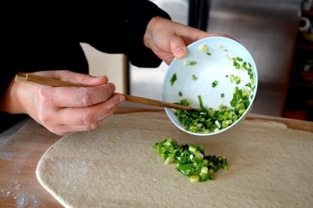 Stir together the chopped scallions, a few tablespoons of oil, and salt, to taste. Spread half of the scallion mixture evenly over the dough.
