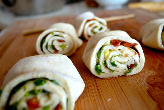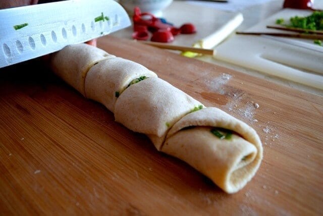 We decided to roll them and cut them much like one would with cinnamon rolls, and then press them into these sort of “butterfly shapes” to keep them from expanding and rolling apart.