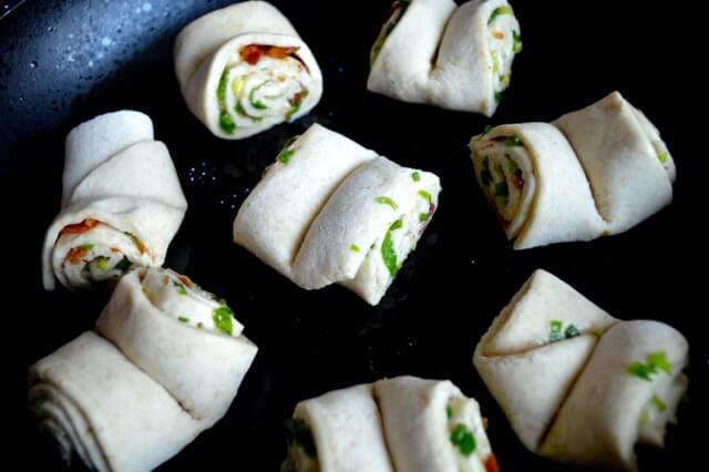 Heat a tablespoon of oil in a non-stick or cast iron skillet over medium high heat. Place the rolls in the pan and let fry for a minute or two.