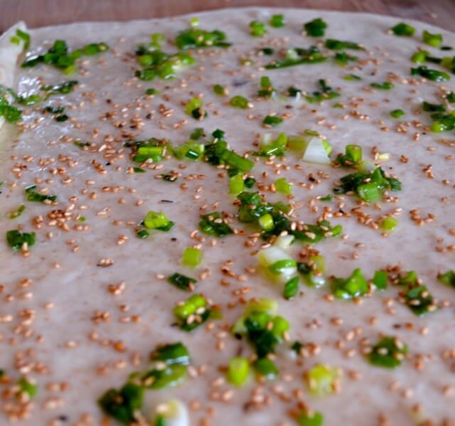 • Take half of the dough and roll it out into a rectangle about a half-inch thick. Stir together the chopped scallions, a few tablespoons of oil, and salt, to taste. Spread half of the scallion mixture evenly over the dough. Sprinkle over half the bacon or 1 tablespoon sesame seeds.