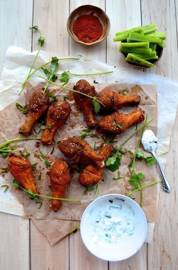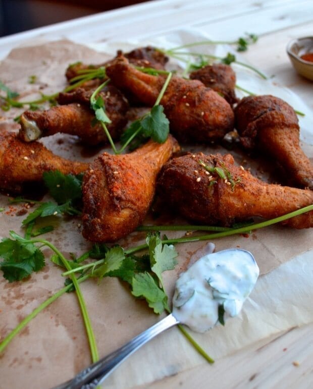 - Prepare your yogurt sauce by simply combining all the ingredients in a small bowl. Set aside. Heat your oil in a small pot or cast iron skillet until it reaches 350 degrees. Fry the chicken in two or three batches for about 5 to 10 minutes, depending upon the size of your drumsticks. If you’re unsure about the doneness, poke a skewer into the thickest part of the drumstick to check if the juices run clear. Drain the fried chicken on paper towels.