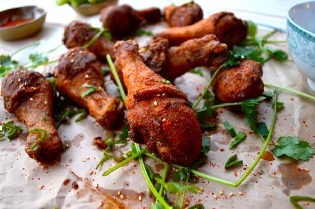 Fry the chicken in two or three batches for about 5 to 10 minutes, depending upon the size of your drumsticks. If you’re unsure about the doneness, poke a skewer into the thickest part of the drumstick to check if the juices run clear. Drain the fried chicken on paper towels.