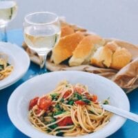 We picked up some herbs, sweet cherry tomatoes, a lemon, a head of garlic, a box of pasta, a little bottle of capers, and a bottle of local white wine. Everything we needed for dinner outside on the terrace with the ocean in front of us. The great thing about this spaghetti with tomatoes, capers, and herbs is that it’s extremely easy to throw together. If we can do it in a tiny apartment kitchen (the extent of the cooking area was probably only four or five feet across), photograph it, and record it here anyone can pull off this recipe.