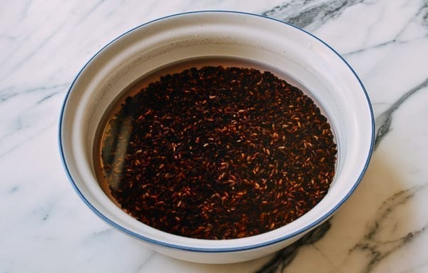 - Rinse the Thai black glutinous rice and soak overnight in 2 cups of water. It should be soaked for at least 8 hours, or up to 24 hours. Pour the rice and the water it was soaking in into a rice cooker and add ¼ cup coconut milk and 3 tablespoons sugar. Stir everything together and turn on the rice cooker. Different rice cookers will handle sticky rice slightly differently, so you may have to press the cook button a couple times until all the liquid is absorbed. Once the rice is cooked, cool completely. (See note for what to do if you don't have a rice cooker.)
