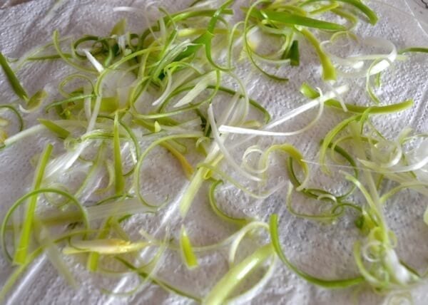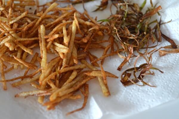 Do the same with the scallion. In a shallow pan, fry the scallions and potatoes in oil until crisp. Drain on paper towels.
