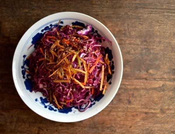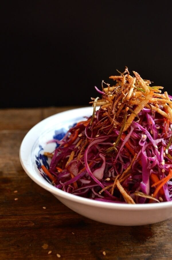 Home ❯ Recipes ❯ Salads ❯ Red Cabbage Salad w/ Crispy Spring Onions and Potato Sticks