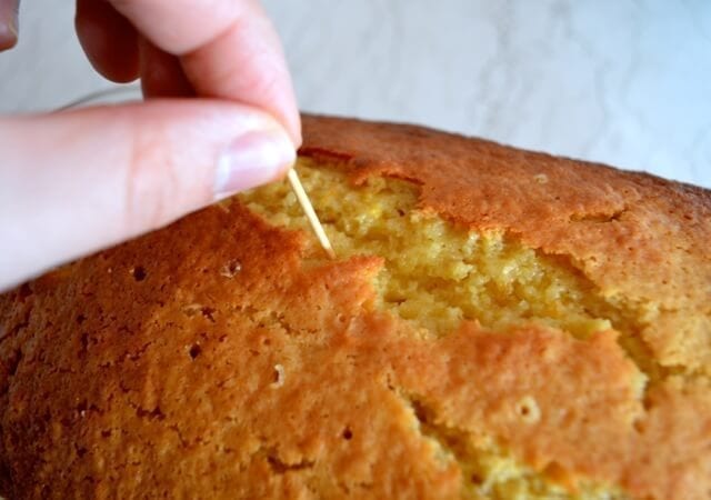 - When the cake is out of the oven, make the syrup by combining the lemon juice, orange juice, and sugar in a small saucepan over medium heat. Keep stirring until the sugar is dissolved. Carefully remove the warm cake from the pan and move to a serving plate, poke the top with a toothpick, and carefully pour the syrup over the top.