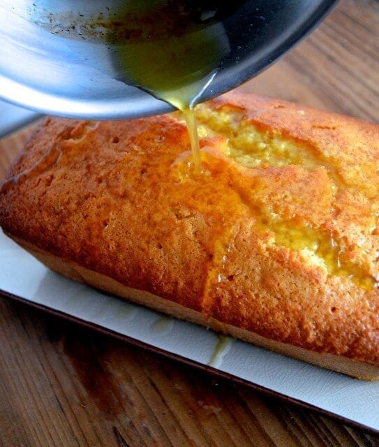 Carefully remove the warm cake from the pan and move to a serving plate, poke the top with your leftover toothpick, and carefully pour the syrup over the top.