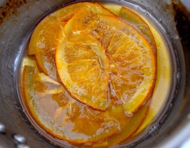 Combine the sugar and water in your medium saucepan and heat the mixture until the sugar dissolves to make a simple syrup. Add the orange slices, reduce the heat to medium low, and simmer for 20 minutes, swirling the slices around occasionally.