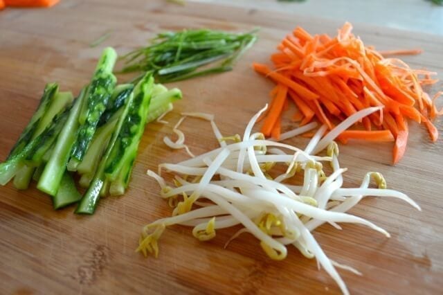 • Stir together all the sauce ingredients in a small bowl until combined. Julienne the scallion, carrot, and cucumber.