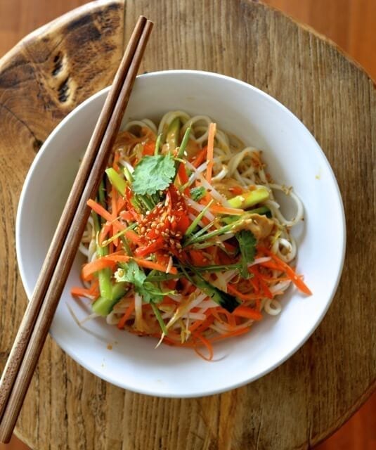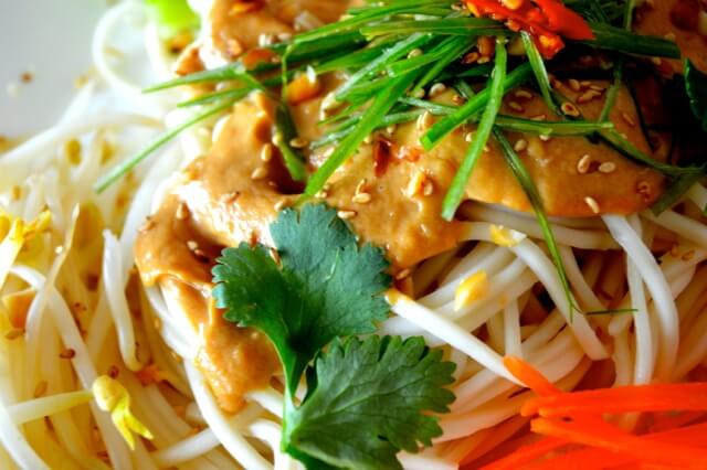 • In a bowl, pour the sauce over the noodles. Add the vegetables, chopped cilantro, crushed peanuts and toasted sesame seeds on top and serve immediately, along with extra toppings like chili sauce, rice vinegar, or soy sauce.