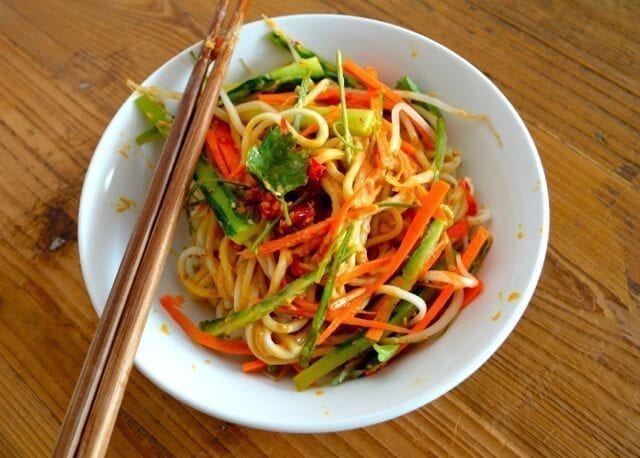 These cold sesame noodles are quick and easy to make, especially if you make a bigger batch of the sauce and store it in a jar in your refrigerator. Just omit the warm water if you decide to make enough for storage and it should keep for a few weeks. You can make the basic dish and then each person can add in whatever extras they like – more soy sauce, Chinese black vinegar, hot chili sauce, etc.