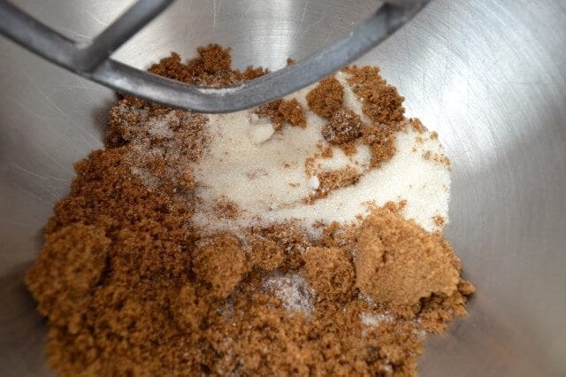 In a large bowl or mixer, add the two sugars.