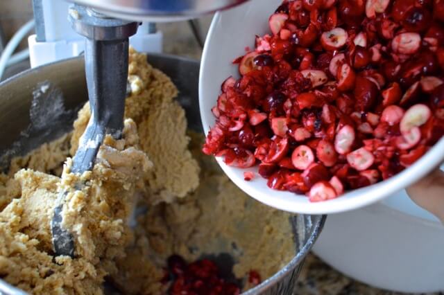 • Preheat the oven to 350 degrees. Chop up your cranberries. In a large bowl or mixer, cream the butter, sugar, and brown sugar together until smooth. Beat in the egg until well combined. Then beat in the orange zest, juice, and vanilla.