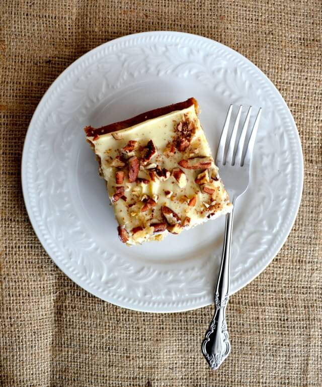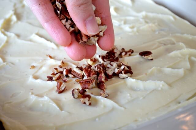 - Pour into prepared pan and bake until a toothpick comes out clean, 45 to 55 minutes. Let cool completely. Beat cream cheese, powdered sugar, vanilla, and milk together to make a smooth frosting. Spread on top of the cake and sprinkle with chopped toasted pecans.