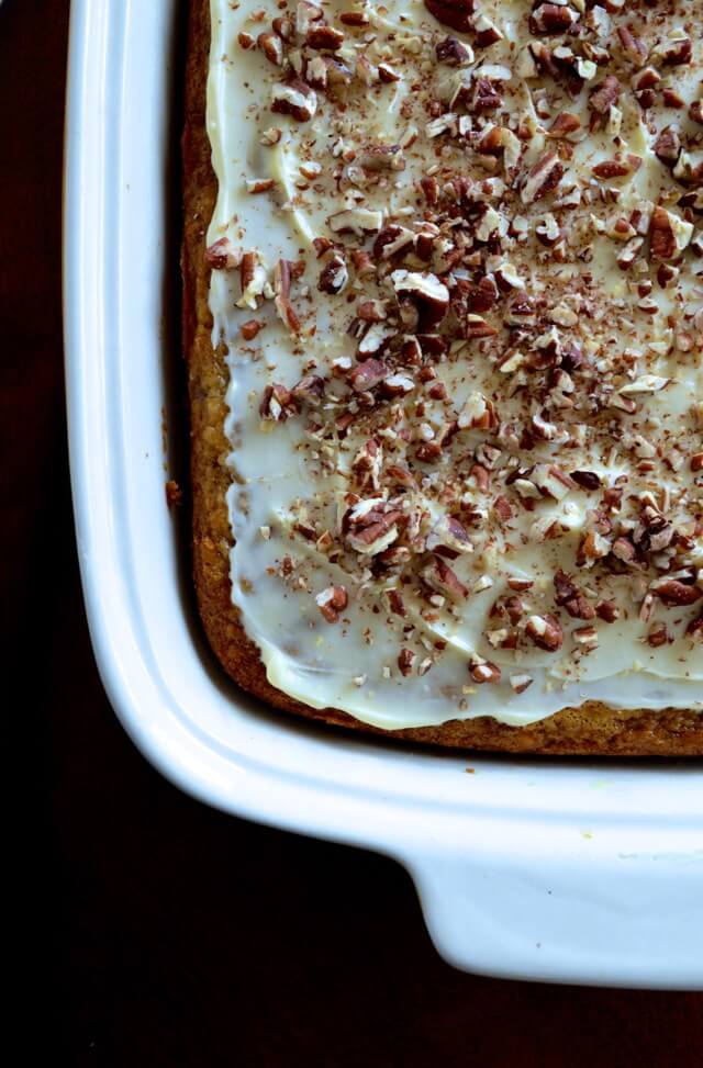 Well, when they do inevitably get all soft and freckly on the countertop, it’s helpful to have an arsenal of recipes like this to turn to. This honey banana cake with cream cheese frosting and toasted pecans is a particularly good option. Moist, banana-y, subtly sweet, and tangy from the cream cheese. The perfect retro classic to cure all your brown banana dilemmas.