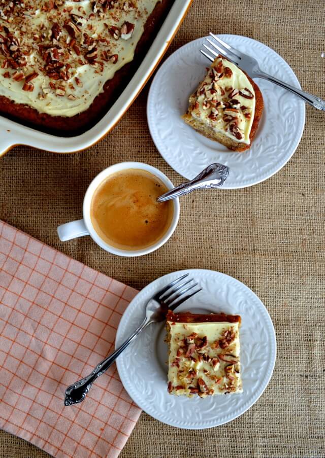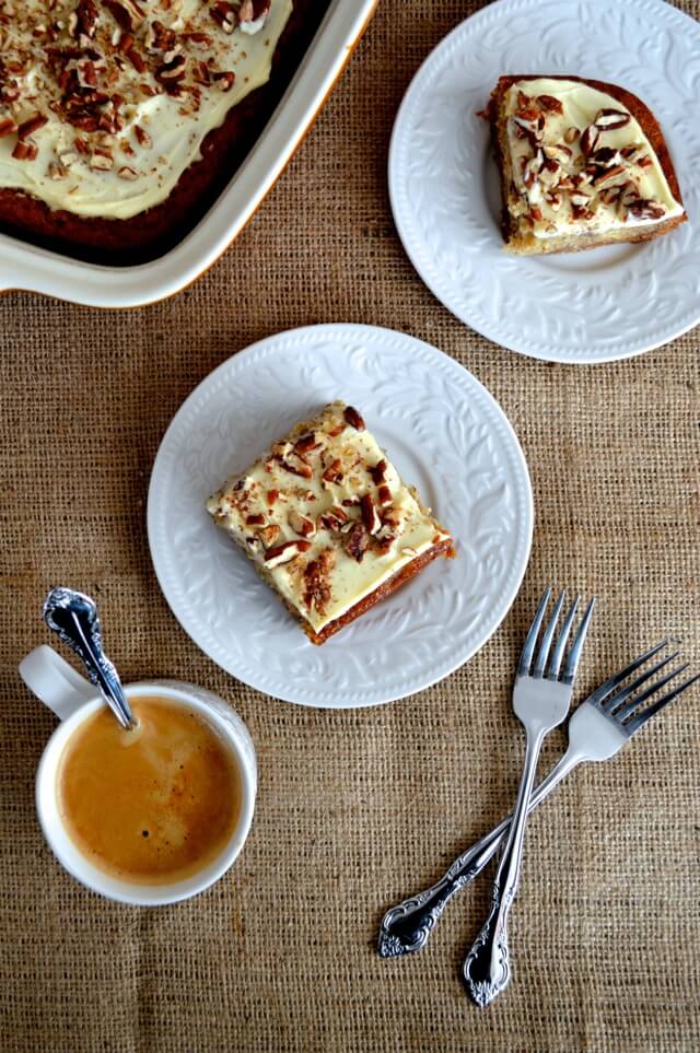 Bake until a toothpick comes out clean, 45 to 55 minutes. Let cool completely. Beat cream cheese, powdered sugar, vanilla, and milk together to make a smooth frosting. Spread on top of the cake and sprinkle with chopped toasted pecans.
