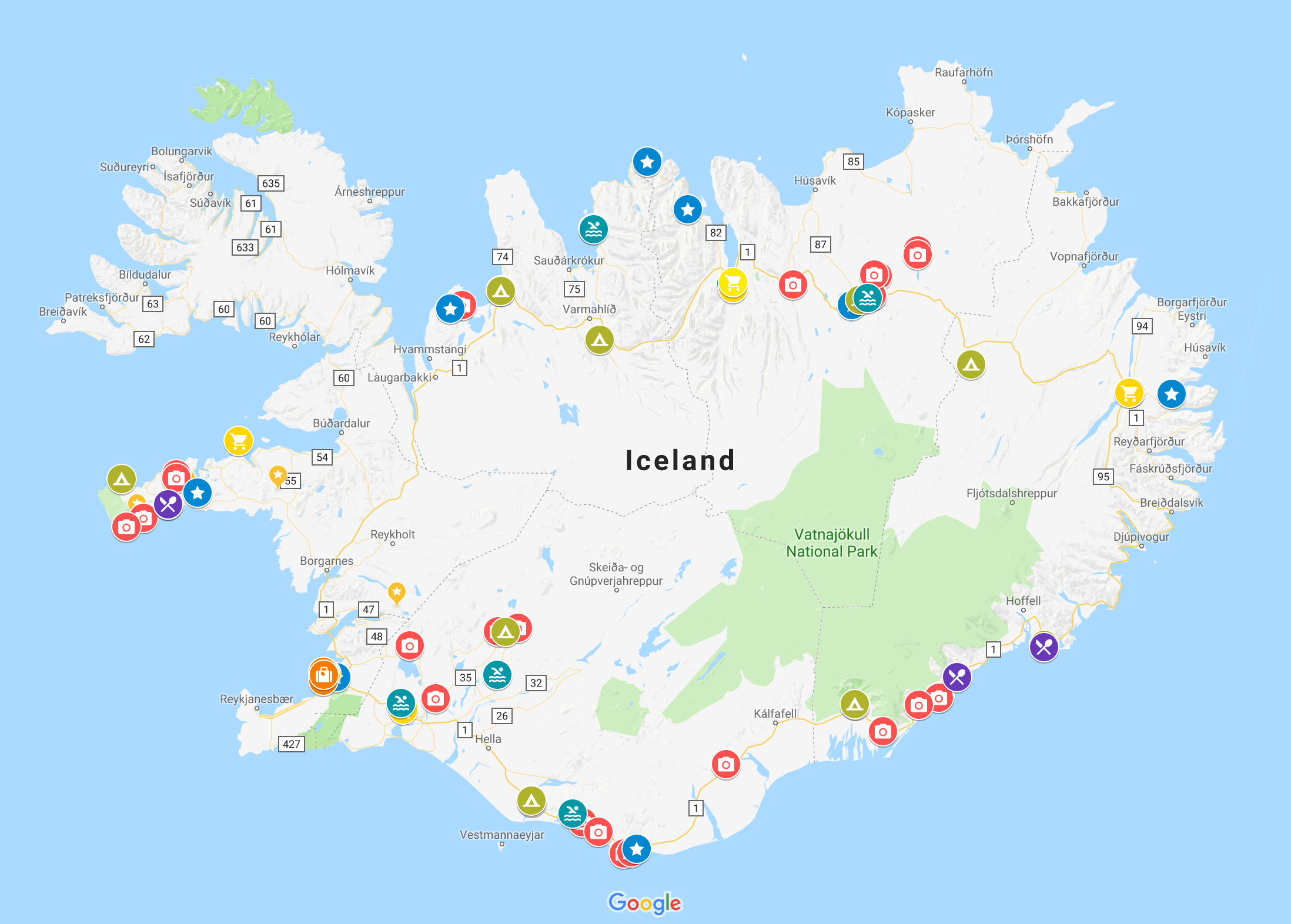 I also went full nerd and made this sweet map, marking everything from sightseeing spots and thermal baths to campgrounds and supermarkets: