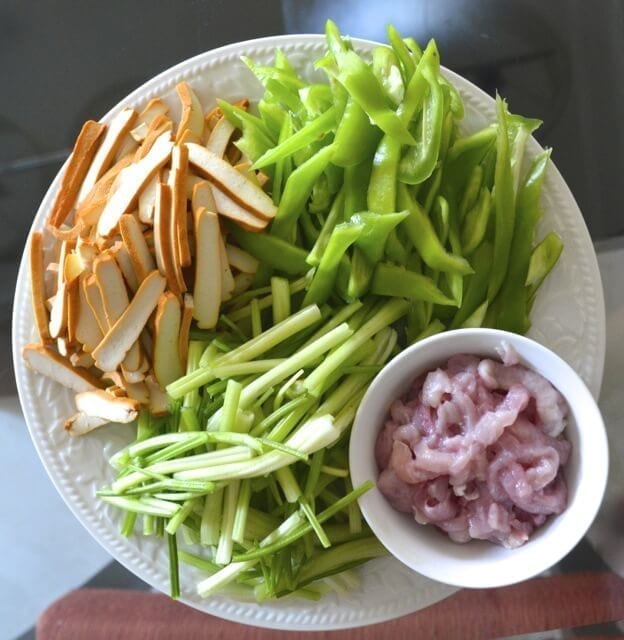 • Combine the marinade ingredients with the pork and allow to sit for 15 minutes while you prep the other ingredients. Slice the tofu, peppers, and celery.