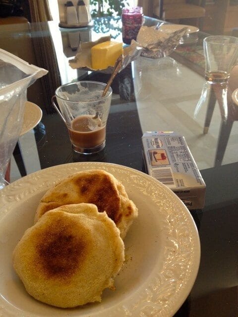 English muffins from scratch for breakfast in Beijing! Sarah took this, and it made me jealous.