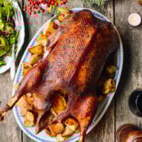 The flavors in this roast goose recipe are similar to what you’d find in a marinade for a Cantonese roast goose (orange peel, ginger, soy, five spice, and garlic), which also mirror classic holiday flavors. Make them with goose fat potatoes for a very special holiday meal!