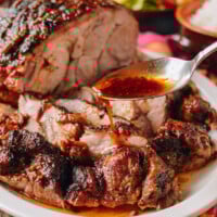 Larger roast: You can still do the initial high heat roast (at 425°F/220°C) for 1 hour. Then cook for the longer end of the range—3-3.5 hours. You won’t have to go much longer than that, because the pork roast can only be so thick!