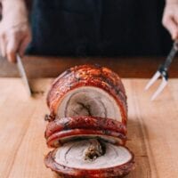 The pork belly skin gets scored and poked to make sure that you get a juicy interior to the roast with plenty of crispy skin. Porchetta can be slow roasted, but we’ve created a recipe that achieves all that flavor and crispy skin in 2½ hours.