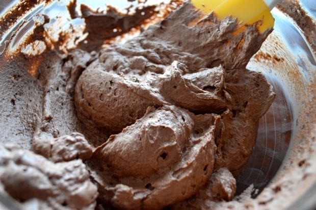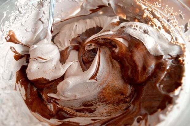 Whip just until the cream reaches the “stiff peaks” stage. In a large bowl, carefully fold about half of the cream into the chocolate, to temper it.