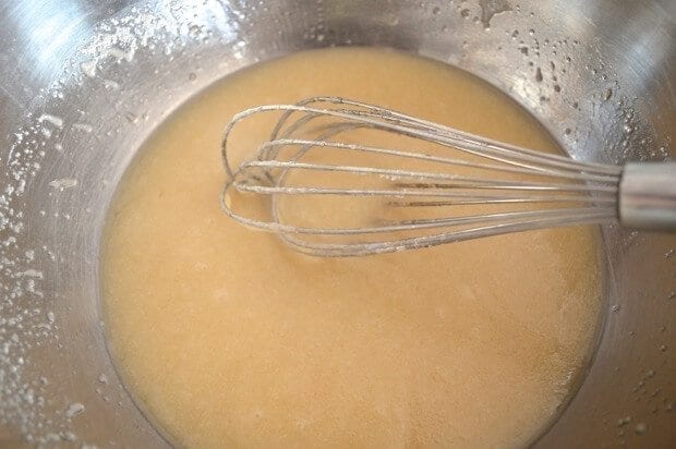 Beat eggs in one at a time, mixing very well after each addition, lest you end up with a bizarre eggy mess at the end of all this. Once the eggs are well-incorporated, gradually add the flour mixture to the wet ingredients.