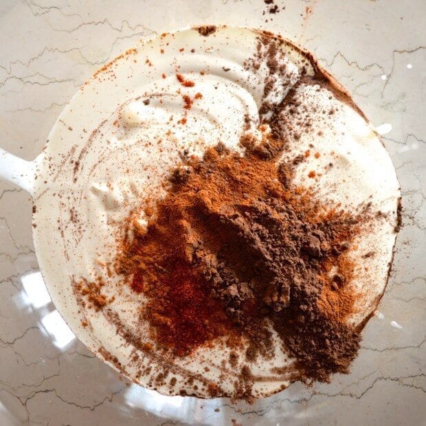 Now it’s time to transform your cream into Mexican-ish deliciousness. Whisk together the heavy cream, cocoa powder, cinnamon and chili powder. You can taste it and add a bit more chili if you like!