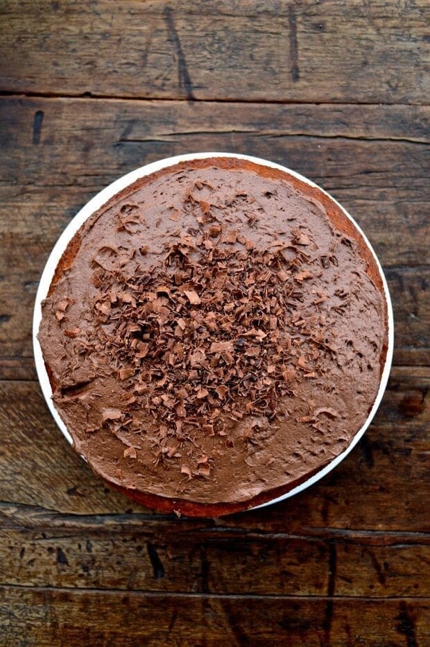 - When the cake is completely cool, layer the cream in the middle and on top of the cake. Garnish with chocolate shavings.