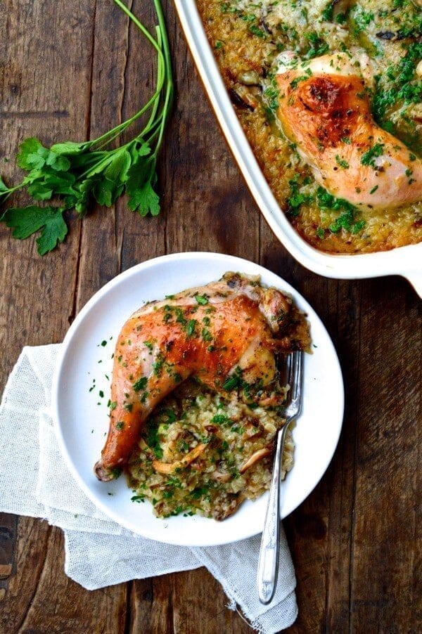 Bake for about 50-60 minutes, or until the chicken is cooked through and the rice is bubbly. Turn on the broiler for a couple minutes if the chicken still needs a bit of color on top. Sprinkle with chopped parsley and serve.