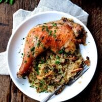This is actually sort of a Western take on this Asian version of Roast Chicken w/ Sticky rice. When baked in a pan, topped with roasted lemon thyme chicken, it’s freaking EPIC.