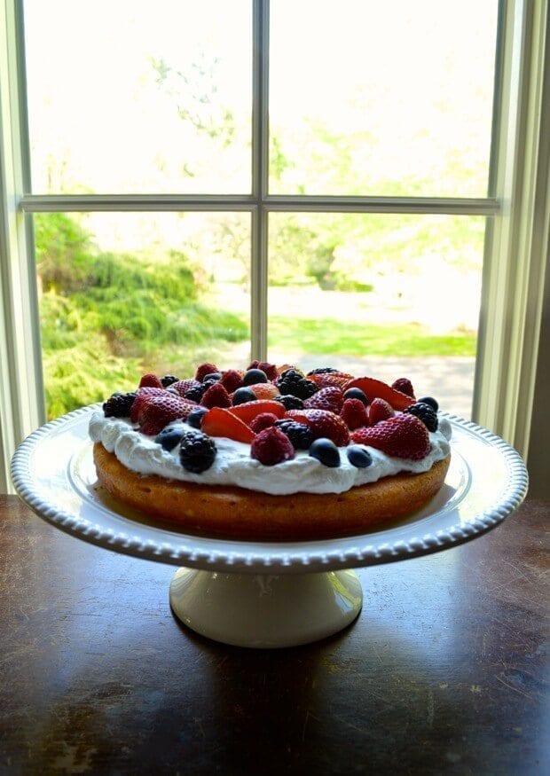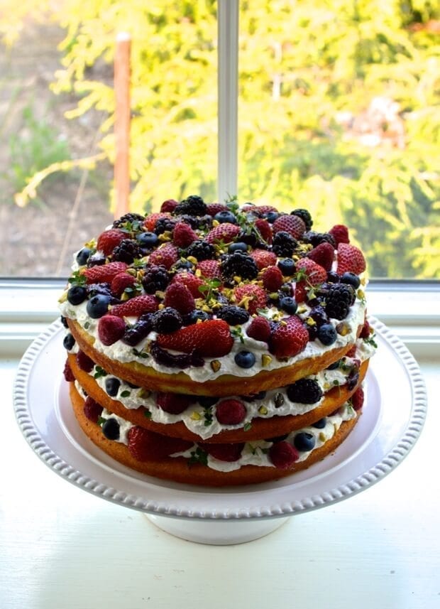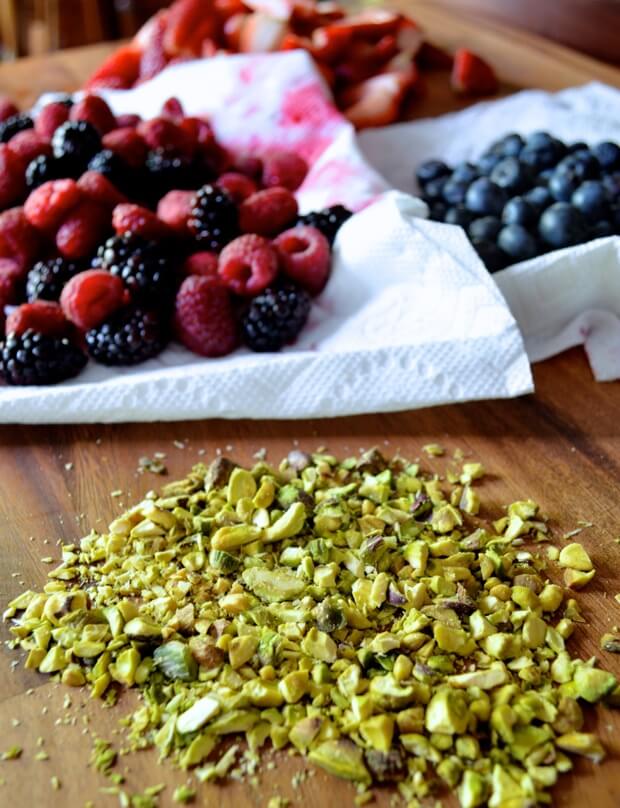 Once everything is cooled completely, put it all together. Get your fruit and other toppings ready. Make sure to wash and dry your berries with a kitchen towel or paper towels before putting them on your cake. The pistachios add an awesome contrast in color here, but you can also try slivered almonds or something similar if that’s what you have on hand.
