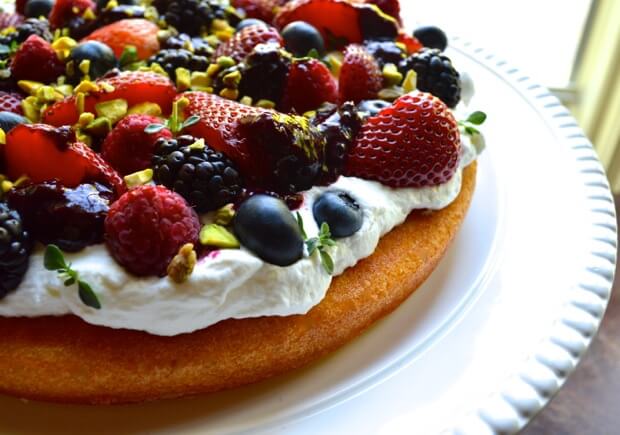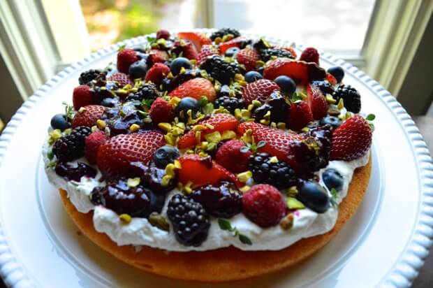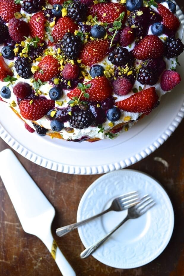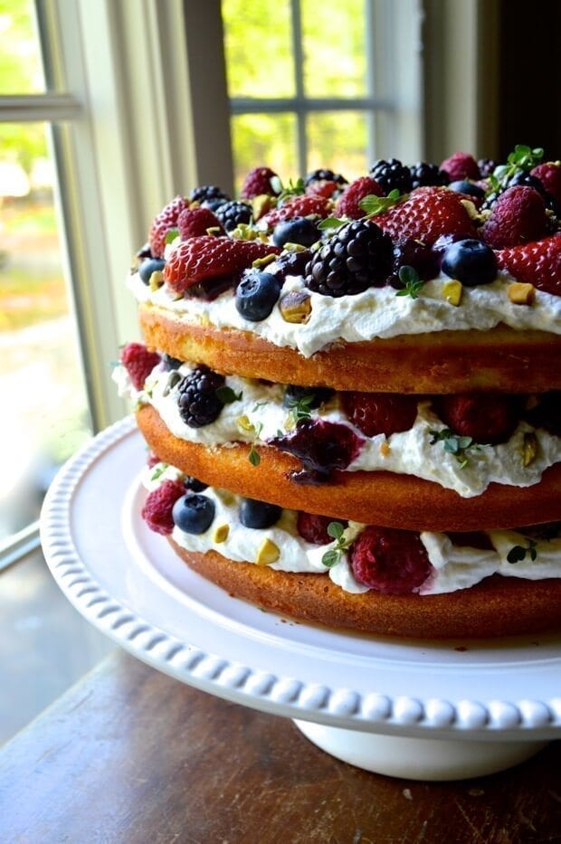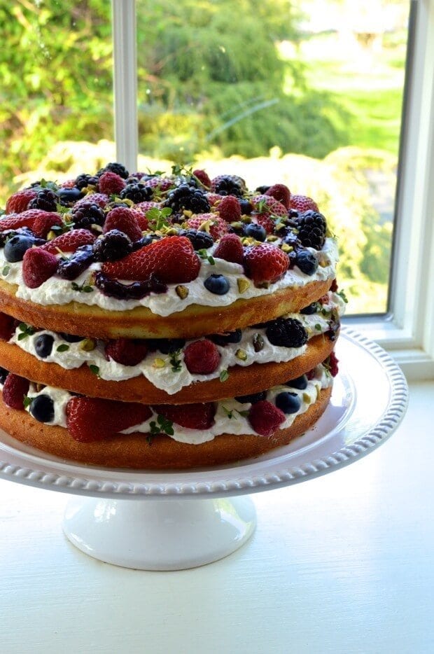 - Once everything is cooled completely, put it all together: Put one layer of your cake onto a cake stand or plate. Top with a third of the whipped cream, a third of the compote, a third of the berries, and a sprinkle of pistachios and thyme leaves. Repeat for the next two layers.