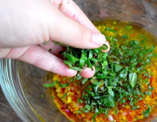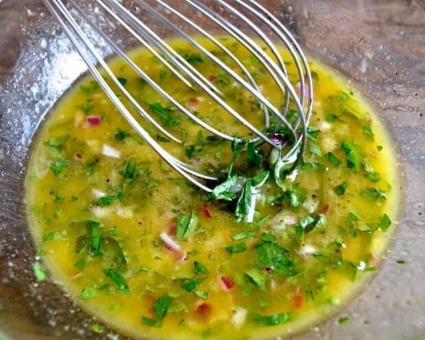 • Start by making the dressing. Combine all dressing ingredients in a bowl and mix together.