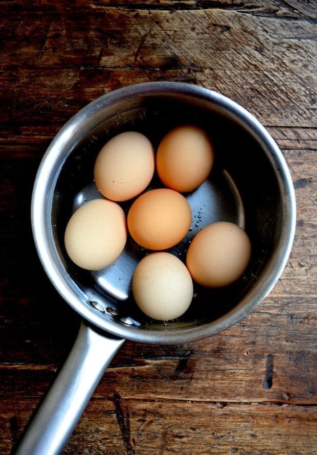 • In a small pot, cover the eggs completely with cold water. Bring to a boil. Once it’s boiling, remove the pot from the heat. Allow the eggs to sit in the hot water for five minutes, and immediately transfer the eggs to a bowl of ice water. Set aside.
