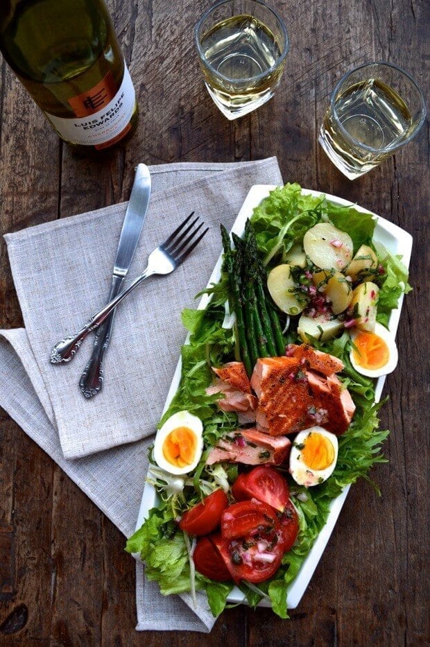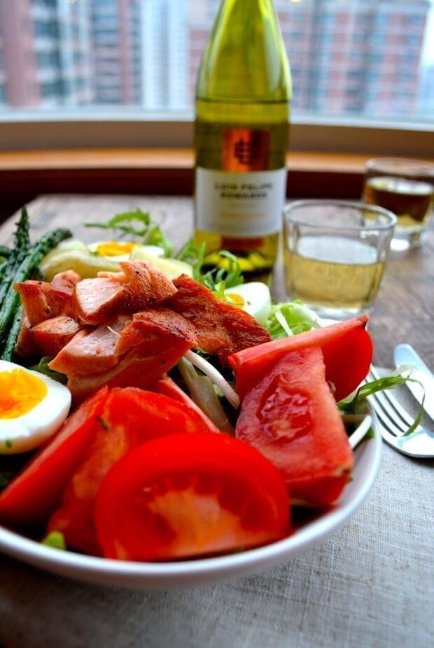 It’s everything I want in a big dinner salad: variety, a hardy protein of some kind, hard boiled eggs cooked until the yolks are just cooked through, and a fancy schmancy French appellation.