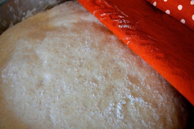 Place the dough into a large floured bowl, cover with a damp cloth, and let rise in a warm room for 1-2 hours, or until doubled in size. And that’s it! That’s the crust. So easy. So deceptively easy.
