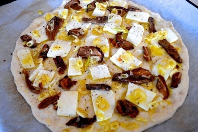 Spread some of the oil, garlic, and mushrooms across the dough, and dot with slices of mozzarella cheese (regular or fresh mozzarella. Both are good). Sprinkle with salt and freshly cracked black pepper.