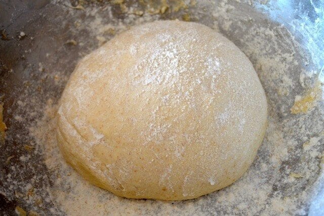 • Pour the yeast mixture into the flour, and stir it in to make a dough. It will be sticky, so with floured hands, knead for 7-10 minutes, adding flour as necessary. Once you have a smooth dough, place it into a large floured bowl, cover with a damp cloth, and let rise in a warm room for 1-2 hours, or until doubled in size.