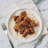 Pork Adobo by The Woks of Life. Recipe URL: https://body-goals.fit/pork-adobo/%3C/em%3E%3C/p%3E%3C/div%3E%3C/div%3E%3Cscript%3Ewindow.wprm_recipes = {"recipe-28123":{"type":"food","name":"Pork Adobo","slug":"wprm-pork-adobo","image_url":"https:\/\/thewoksoflife.com\/wp-content\/uploads\/2016\/12\/pork-adobo-4-1.jpg","rating":{"count":64,"total":311,"average":4.86,"type":{"comment":64,"no_comment":0,"user":0},"user":0},"ingredients":[{"uid":0,"amount":"2","unit":"tablespoons","name":"neutral oil","notes":"(such as vegetable, canola, or avocado oil)","converted":{"2":{"amount":"30","unit":"ml","unit_id":5271}},"unit_id":5259,"id":1095,"conversion_item_snapshot":{"amount":"2","unit":"tablespoons","timestamp":1774165527000},"type":"ingredient","unit_systems":{"unit-system-1":{"amount":"2","unit":"tablespoons","unitParsed":"tablespoons"},"unit-system-2":{"amount":"30","unit":"ml","unitParsed":"ml"}}},{"uid":1,"amount":"2","unit":"pounds","name":"boneless pork shoulder or pork butt","notes":"(cut into large chunks)","converted":{"2":{"amount":"1","unit":"kg","unit_id":5286}},"unit_id":5258,"id":5408,"conversion_item_snapshot":{"amount":"2","unit":"pounds","timestamp":1774165527000},"type":"ingredient","unit_systems":{"unit-system-1":{"amount":"2","unit":"pounds","unitParsed":"pounds"},"unit-system-2":{"amount":"1","unit":"kg","unitParsed":"kg"}}},{"uid":2,"amount":"\u00bc","unit":"cup","name":"cane vinegar or white vinegar","notes":"","converted":{"2":{"amount":"60","unit":"ml","unit_id":5271}},"unit_id":5269,"id":2305,"conversion_item_snapshot":{"amount":"\u00bc","unit":"cup","timestamp":1774165527000},"type":"ingredient","unit_systems":{"unit-system-1":{"amount":"\u00bc","unit":"cup","unitParsed":"cup"},"unit-system-2":{"amount":"60","unit":"ml","unitParsed":"ml"}}},{"uid":3,"amount":"\u2153","unit":"cup","name":"low sodium soy sauce","notes":"","converted":{"2":{"amount":"80","unit":"ml","unit_id":5271}},"unit_id":5269,"id":2306,"conversion_item_snapshot":{"amount":"\u2153","unit":"cup","timestamp":1774165527000},"type":"ingredient","unit_systems":{"unit-system-1":{"amount":"\u2153","unit":"cup","unitParsed":"cup"},"unit-system-2":{"amount":"80","unit":"ml","unitParsed":"ml"}}},{"uid":4,"amount":"6","unit":"cloves","name":"garlic","notes":"(chopped)","unit_id":5267,"id":269,"conversion_item_snapshot":{"amount":"6","unit":"cloves","timestamp":1774165527000},"type":"ingredient","unit_systems":{"unit-system-1":{"amount":"6","unit":"cloves","unitParsed":"cloves"}}},{"uid":5,"amount":"1","unit":"","name":"bay leaf","notes":"","id":2307,"conversion_item_snapshot":{"amount":"1","unit":"","timestamp":1774165527000},"type":"ingredient","unit_systems":{"unit-system-1":{"amount":"1","unit":"","unitParsed":""}}},{"uid":6,"amount":"2","unit":"teaspoons","name":"black peppercorns","notes":"","converted":{"2":{"amount":"4","unit":"g","unit_id":5264}},"unit_id":5273,"id":1632,"conversion_item_snapshot":{"amount":"2","unit":"teaspoons","timestamp":1774165527000},"type":"ingredient","unit_systems":{"unit-system-1":{"amount":"2","unit":"teaspoons","unitParsed":"teaspoons"},"unit-system-2":{"amount":"4","unit":"g","unitParsed":"g"}}},{"uid":7,"amount":"2","unit":"teaspoons","name":"sugar","notes":"(or brown sugar)","converted":{"2":{"amount":"8","unit":"g","unit_id":5264}},"unit_id":5273,"id":273,"conversion_item_snapshot":{"amount":"2","unit":"teaspoons","timestamp":1774165527000},"type":"ingredient","unit_systems":{"unit-system-1":{"amount":"2","unit":"teaspoons","unitParsed":"teaspoons"},"unit-system-2":{"amount":"8","unit":"g","unitParsed":"g"}}},{"uid":8,"amount":"2","unit":"cups","name":"water","notes":"","converted":{"2":{"amount":"475","unit":"ml","unit_id":5271}},"unit_id":5265,"id":332,"conversion_item_snapshot":{"amount":"2","unit":"cups","timestamp":1774165527000},"type":"ingredient","unit_systems":{"unit-system-1":{"amount":"2","unit":"cups","unitParsed":"cups"},"unit-system-2":{"amount":"475","unit":"ml","unitParsed":"ml"}}}],"originalServings":"6","originalServingsParsed":6,"currentServings":"6","currentServingsParsed":6,"currentServingsFormatted":"6","currentServingsMultiplier":1,"originalSystem":1,"currentSystem":1,"unitSystems":[1,2],"originalAdvancedServings":{"shape":"round","unit":"inch","diameter":0,"width":0,"length":0,"height":0},"currentAdvancedServings":{"shape":"round","unit":"inch","diameter":0,"width":0,"length":0,"height":0}}}