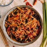 Now add the ginger, garlic, and dried chili peppers. Stir for about 15 seconds. Add the wood ears, turn up the heat, and stir fry for 30 seconds (you can add a few drops of water if it’s too dry), making sure everything is well-combined.