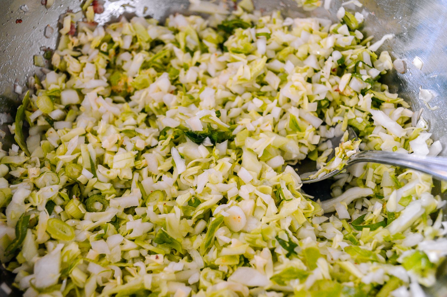 No need to make it perfect. Very lightly oil the dough and spread on about an eighth of your pork mixture. Then add about 2 tablespoons cabbage to one end.